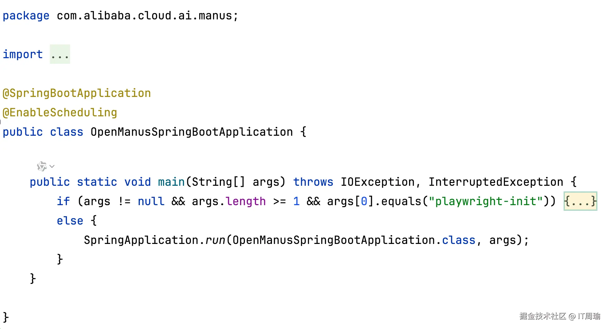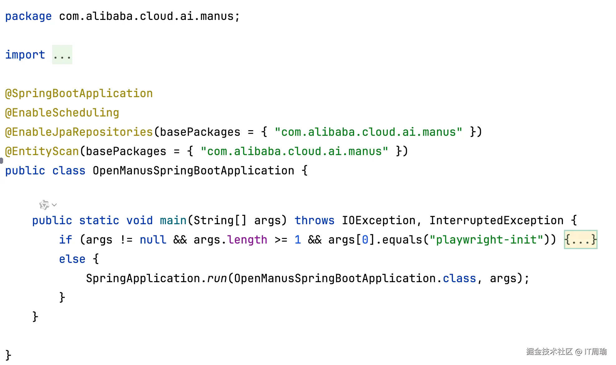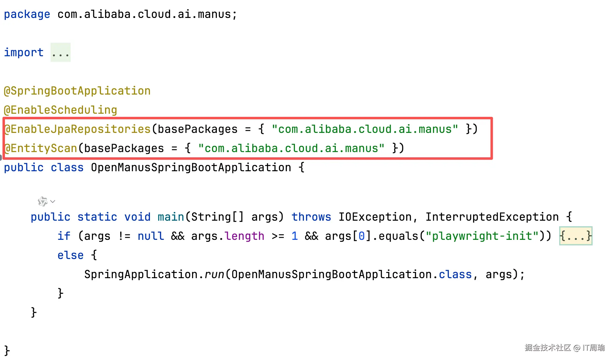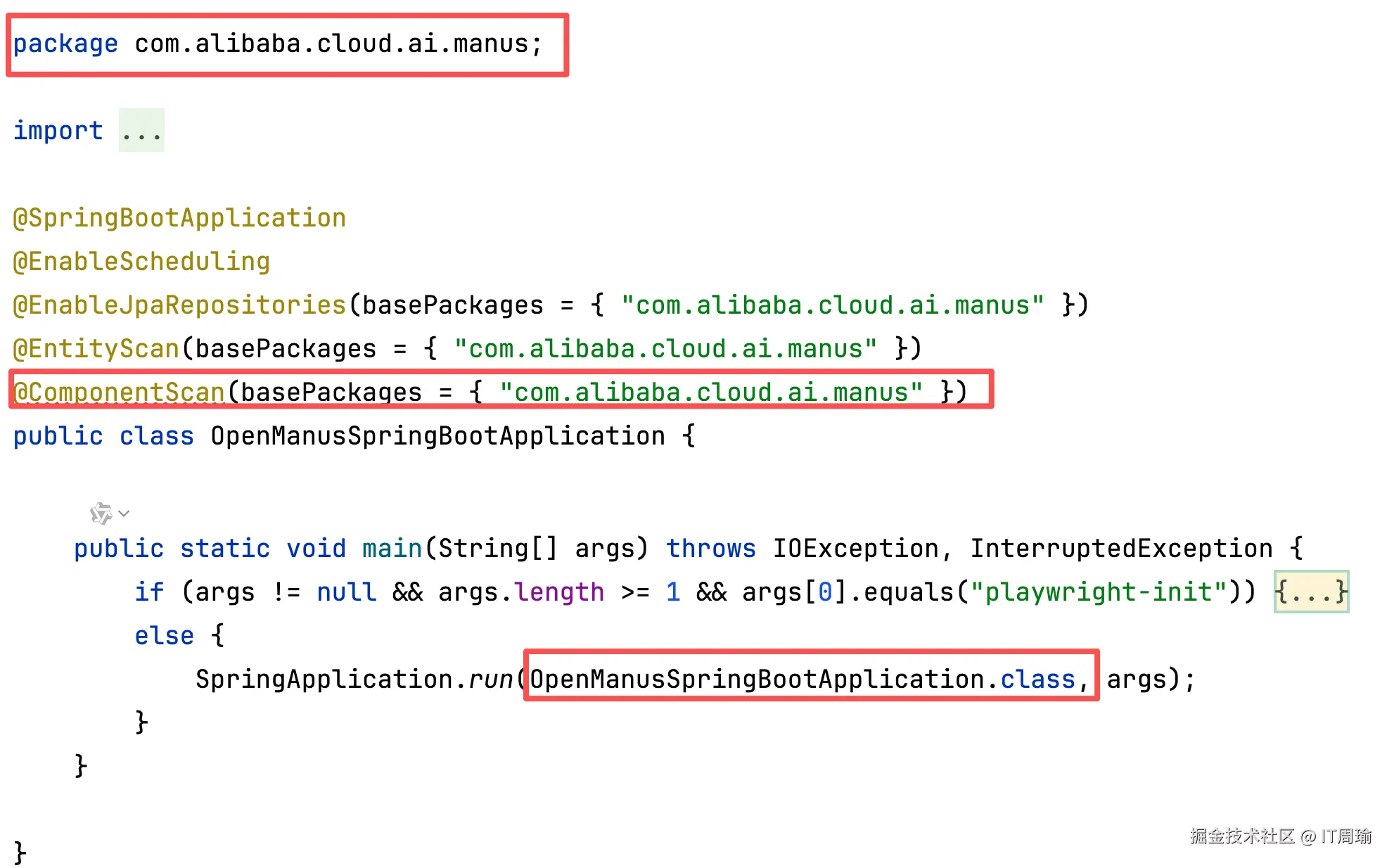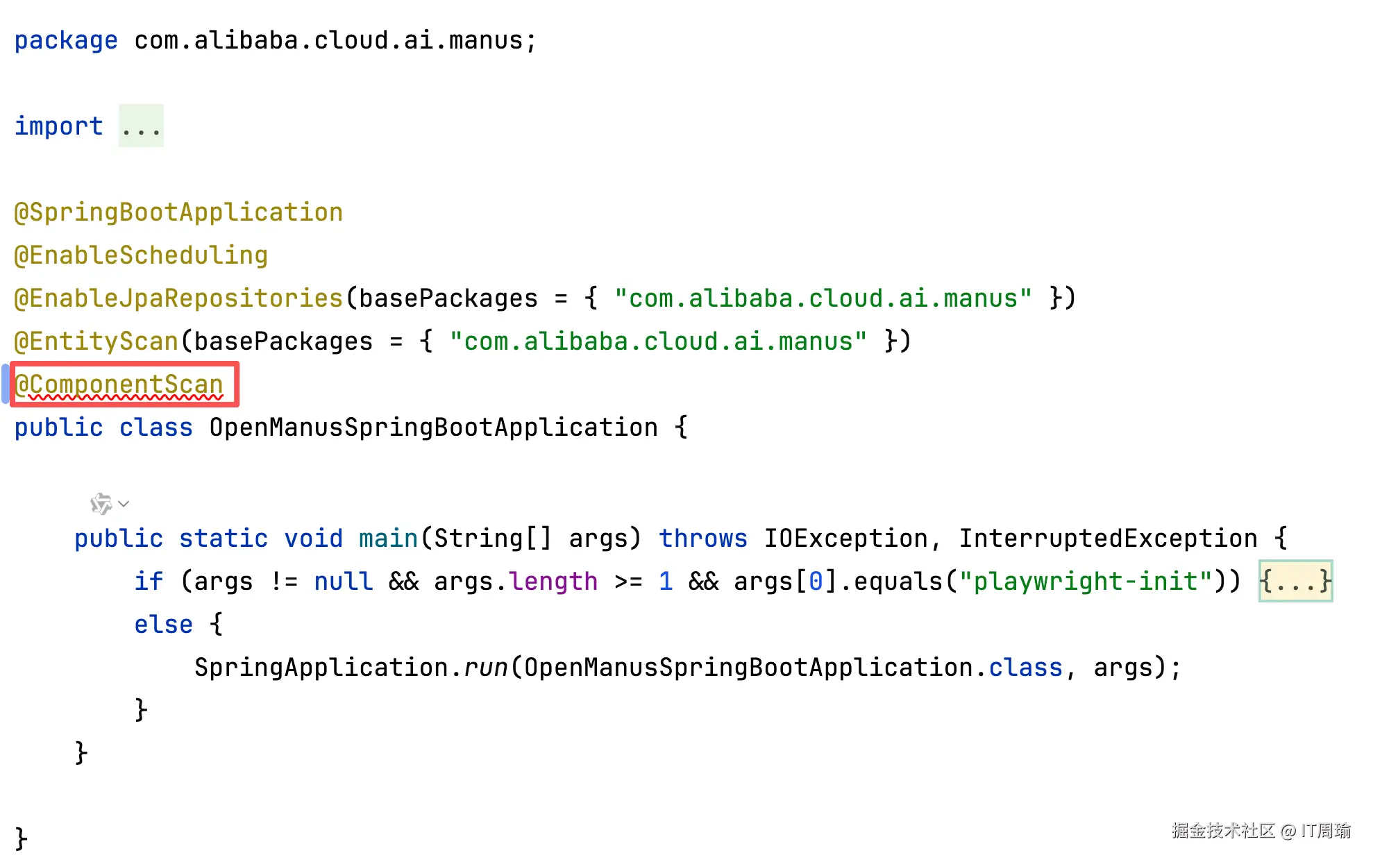 在SpringBoot中,如果你没有自定义设置扫描路径,那么SpringBoot默认会取传递给run()方法的配置类(通常就是启动类)所在的包路径,来作为Bean的扫描路径,回到以上代码,很明显,@ComponentScan注解设置的扫描路径,其实就是OpenManusSpringBootApplication这个类所在的包路径,既然是一样的,那么就完全没必要重复设置了,直接这样就可以了: