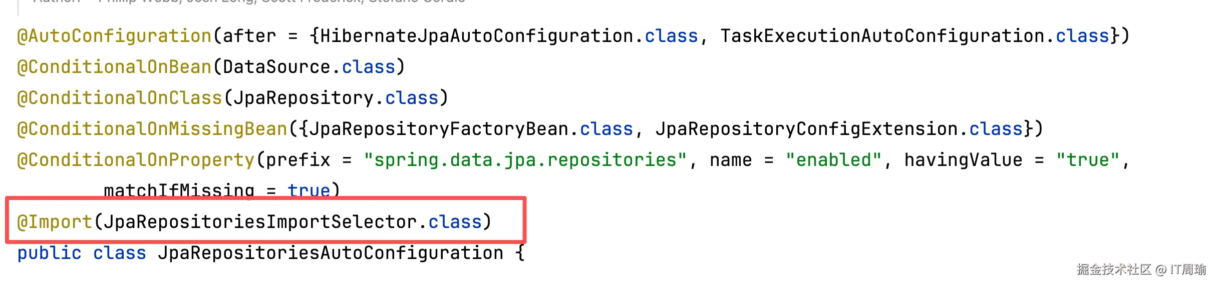先来看Repositories的扫描,在JpaRepositoriesAutoConfiguration这个自动配置类中,会先导入JpaRepositoriesImportSelector: