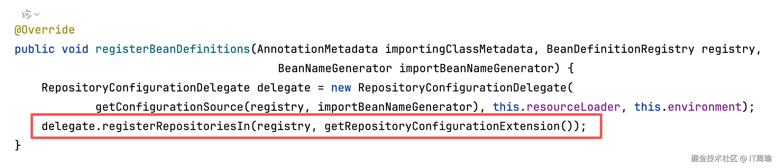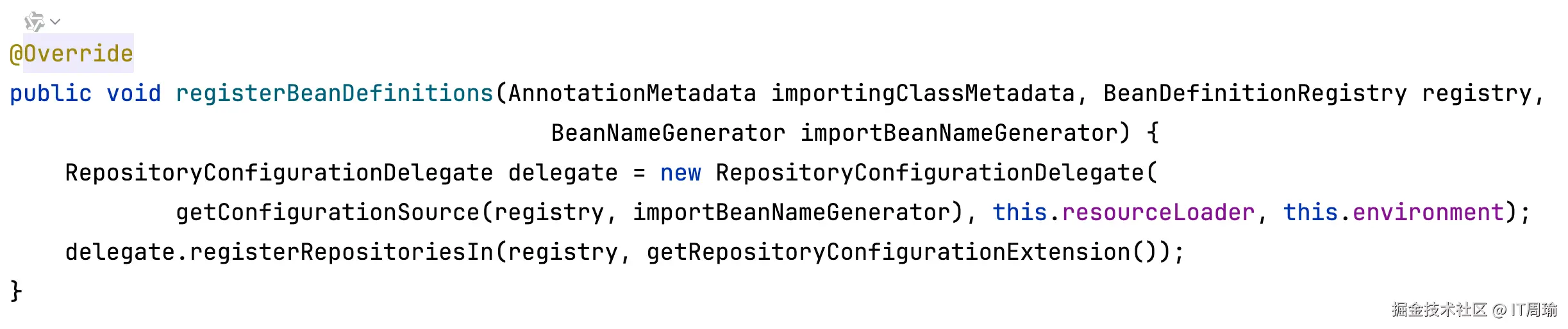 从JpaRepositoriesRegistrar的类名就知道,它就是用来注册Repositories的,它是一ImportBeanDefinitionRegistrar,它里面有一个registerBeanDefinitions()方法,就是核心用来注册Bean的: