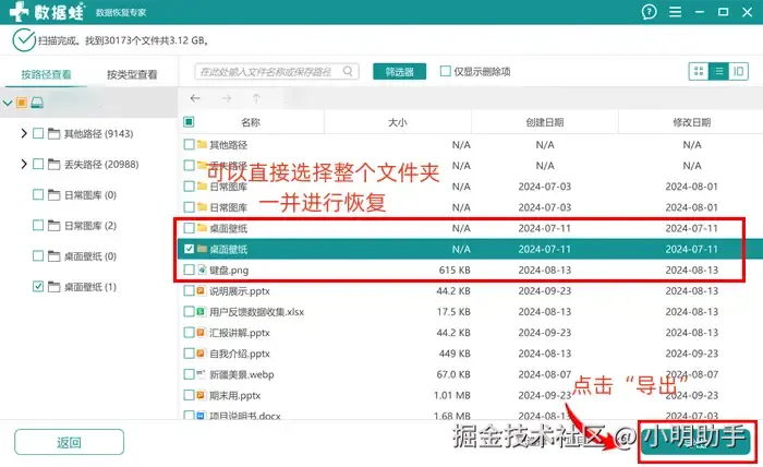 步骤2: 在软件扫描出来的文件中,我们可以根据自己的需求选择恢复的文件,选好后点击“导出”;