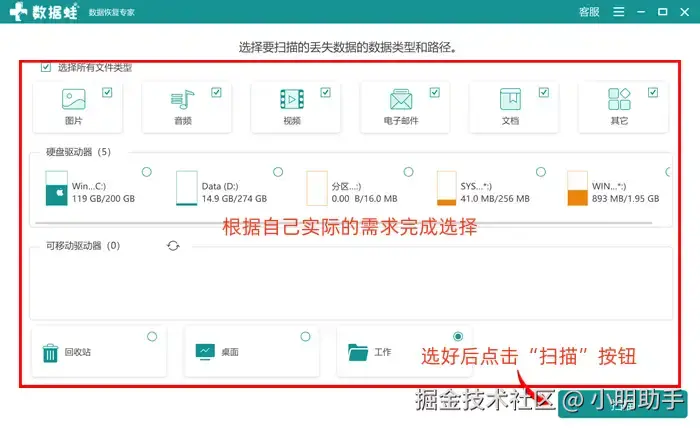 步骤1: 打开软件后直接进入扫描准备页面,在上方选择文件的类型,下方选择即将进行扫描的位置,确保选择正确后点击“扫描”;