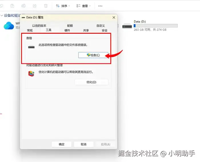 步骤2: 打开属性页面后,在窗口上选择“工具”,在“查错”区域中点击“检查”的按钮。