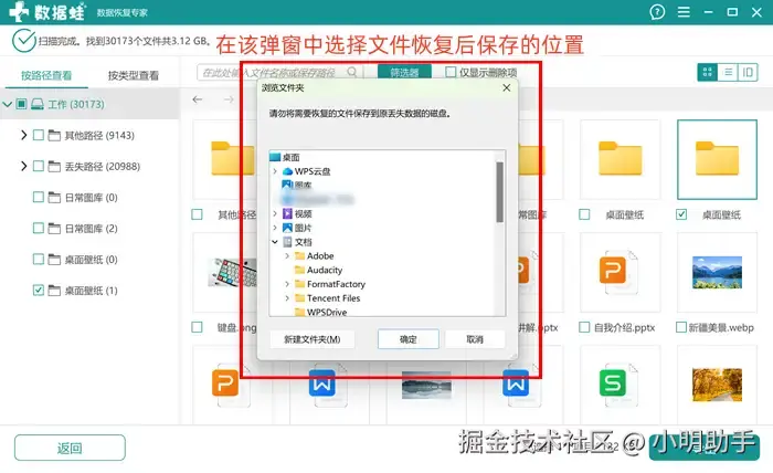 步骤3: 点击完“导出”后还没结束,我们还需要在“浏览文件夹”的弹窗中,选择文件在恢复导出后存放的位置。