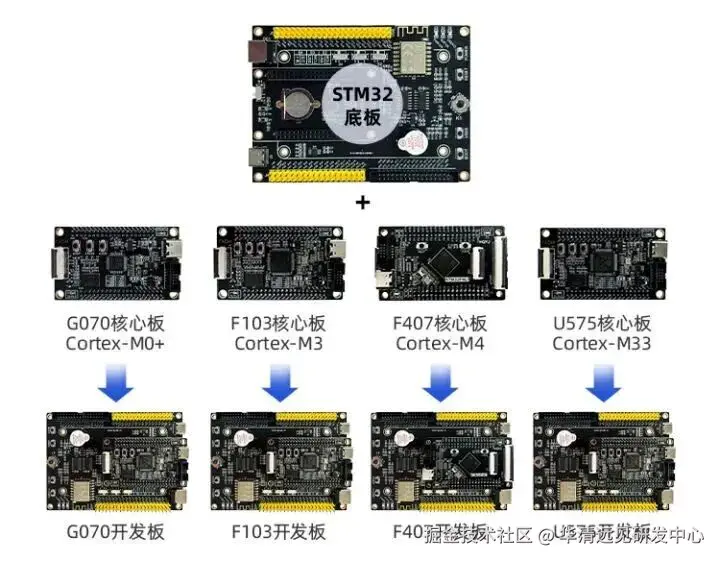 该开发板采用“底板+核心板”分离设计,底板通用兼容STM32F103、F407、U575、G070等多核心板,开发者不需要重复购买整套设备,仅更换核心板即可实战不同型号STM32。