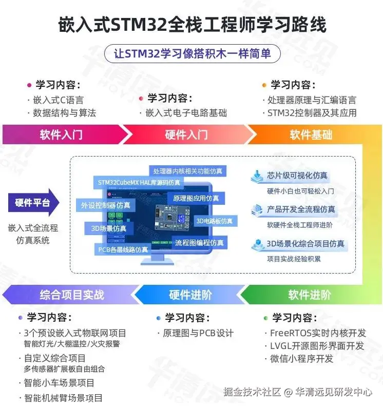 此外,该系统还配套体系化视频课程,直击企业用人需求,课程内容从软硬件基础入门开始,包括C语言基础、数据结构,基础电子电路等,到核心软硬件技能学习,包括STM32裸机开发、FreeRTOS实时操作系统、LVGL图形界面开发、原理图与PCB设计。再到综合项目实战方面,包括基于LVGL物联网项目实战、基于RTOS的智能车及智能机械臂3D场景项目实战。同时,仿真系统还可与实体 STM32多核心开发板联动,实现虚拟仿真到硬件操作的无缝衔接,降低试错与时间成本,提升技能完整性,助力学习者高效成长为嵌入式全栈工程师。
