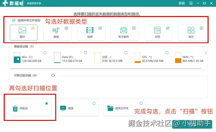 第1步: 在首页上根据提示选好需要恢复的文件类型,再选好进行扫描的位置,完成两项选择后再点击“扫描”按钮,启动软件进行扫描工作;
