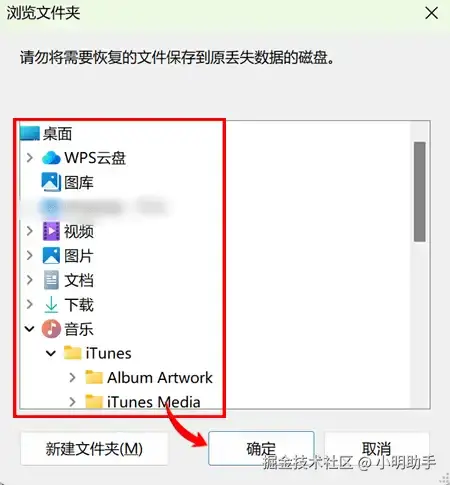 第3步: 在“浏览文件夹”中选择合适的文件存放位置,点击后按下“确定”的按钮,耐心等待软件完成恢复任务。
