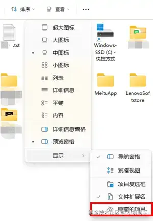 第2步: 在新的列表指出“显示”,最后在“显示”的列表点击“隐藏的项目”。