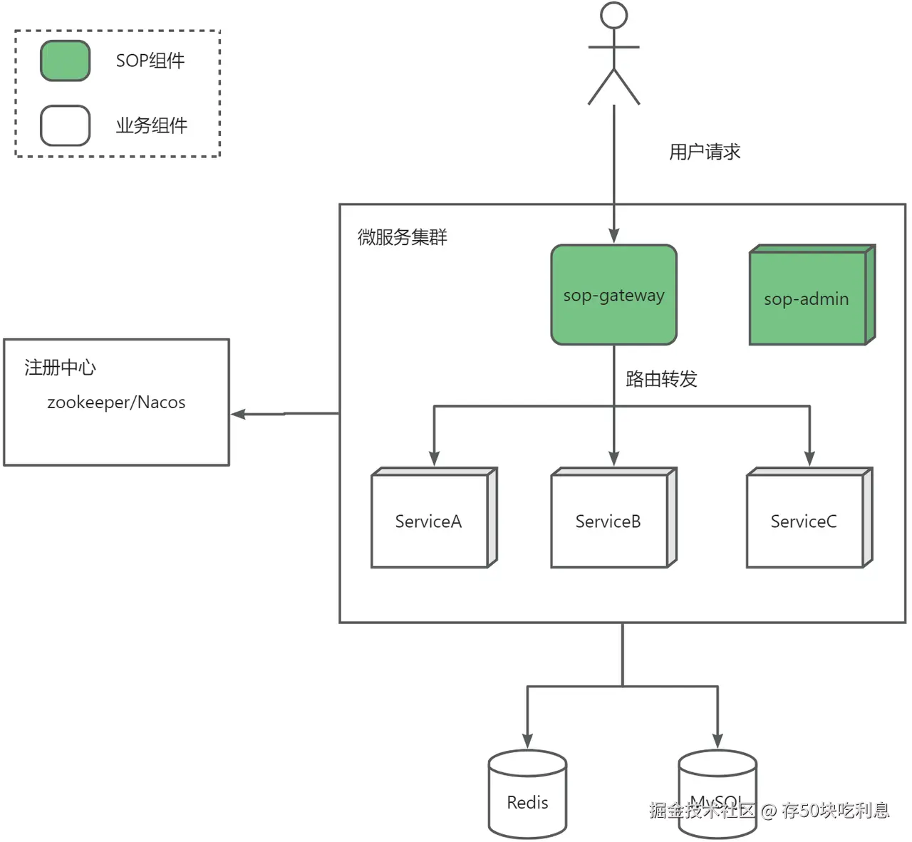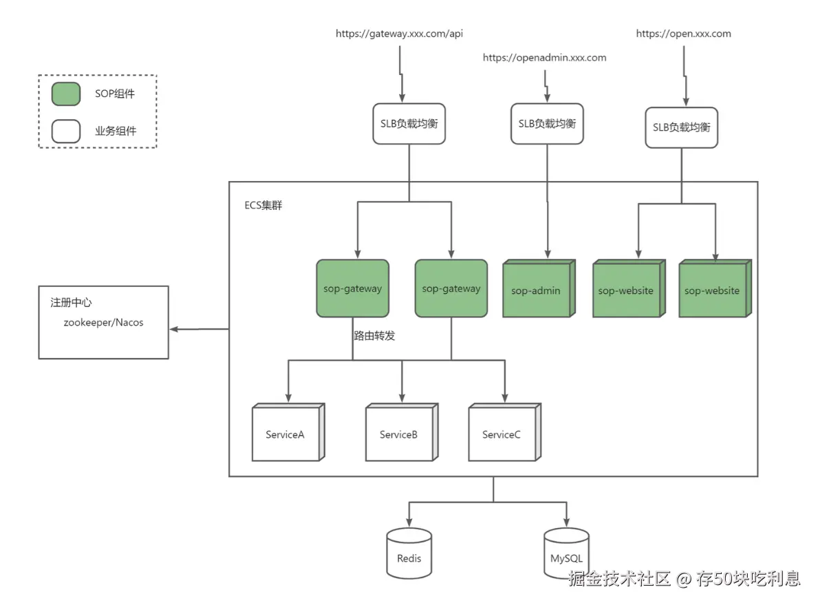 如上图所示,流量经过负载均衡后会流向sop的不同模块,admin模块负责接收并处理sop后台管理类相关的请求,website模块负责接收api文档网站的相关请求,而 gateway 模块的作用是为平台提供业务服务的流量转发能力,负责接收上游请求并精准转发至下游业务服务。