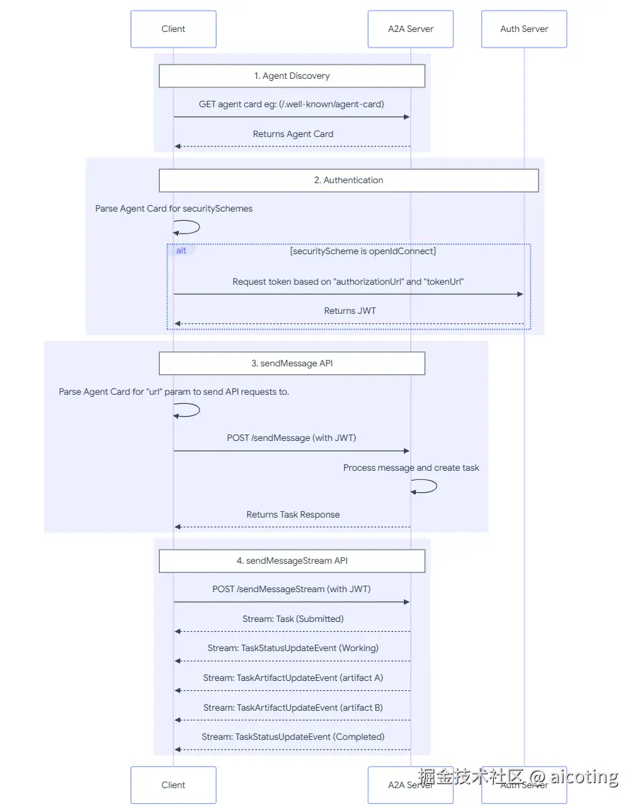 - 客户端发起请求,发现目标Agent,返回Agent card