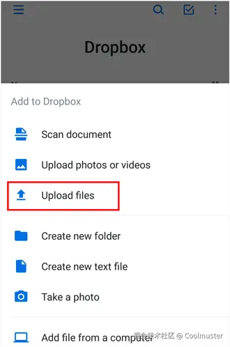 第 2 步:在您的华为手机上,点击底部的“+”图标,然后点击上传文件,选择所需的文件,然后将其上传到您的 Dropbox。