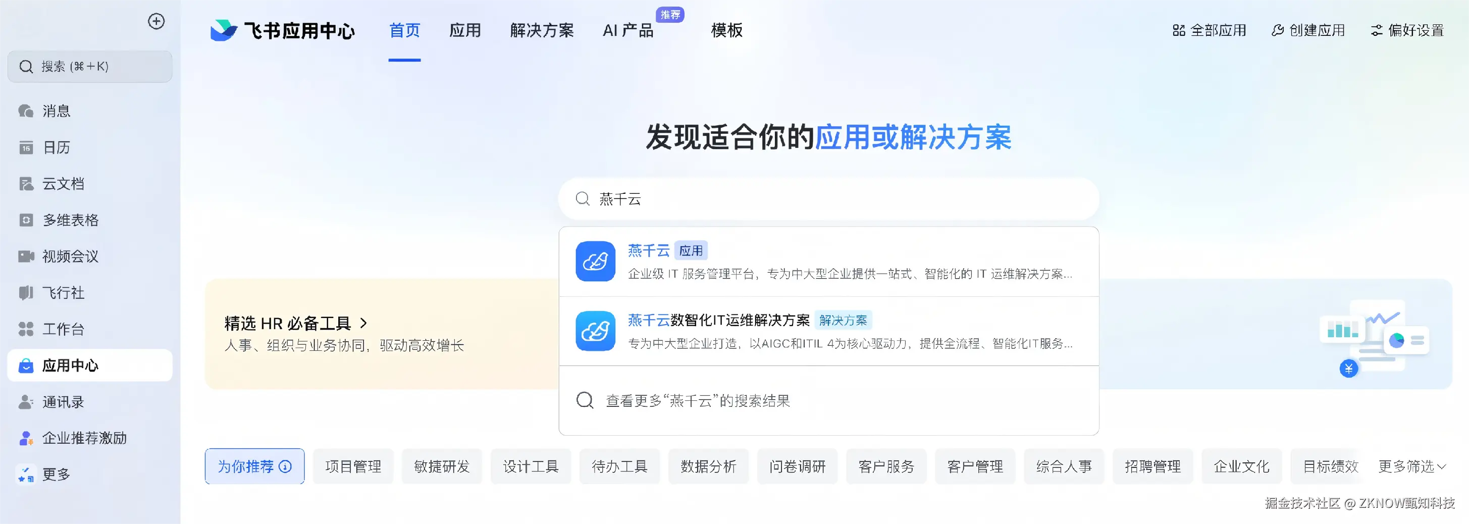 第一步,在飞书应用中心搜索 “燕千云” 并点击进入,全程无需脱离飞书生态;