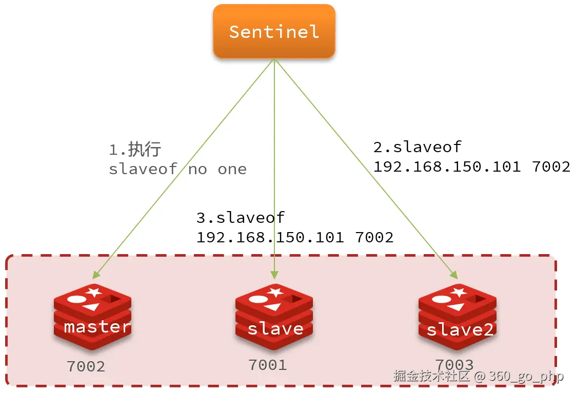 - 选举出一个 Sentinel 作为 Leader:集群中至少有三个 Sentinel 节点,但只有其中一个节点可完成故障转移.通过以下命令可以进行失败判定或领导者选举。