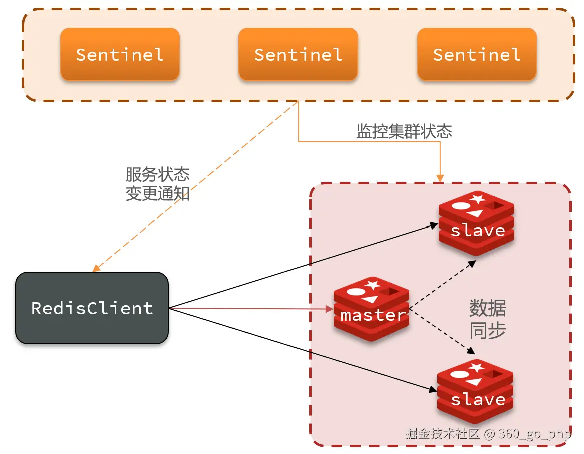 Redis Sentinel是社区版本推出的原生高可用解决方案,其部署架构主要包括两部分:Redis Sentinel集群和Redis数据集群。