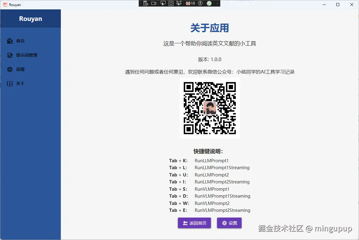 Rouyan的简介是Less Copying,More Convenience,说实话实现的功能用ChatBox类工具如CherryStudio也都能实现,所以没什么特别的,只是对我而言有些场景减少了复制粘贴。接下来我将以自己的使用场景来介绍Rouyan的功能。