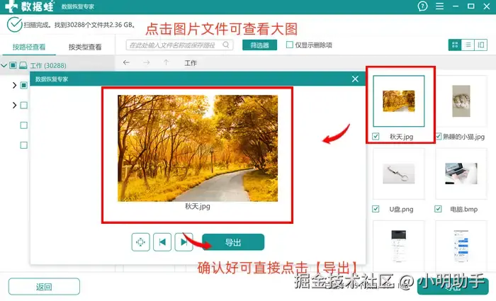 步骤2: 在扫描出来的文件中,如果需要恢复的文件为图片,我们可以在恢复前就点击查看图片内容,确认为目标文件后再点击【导出】;