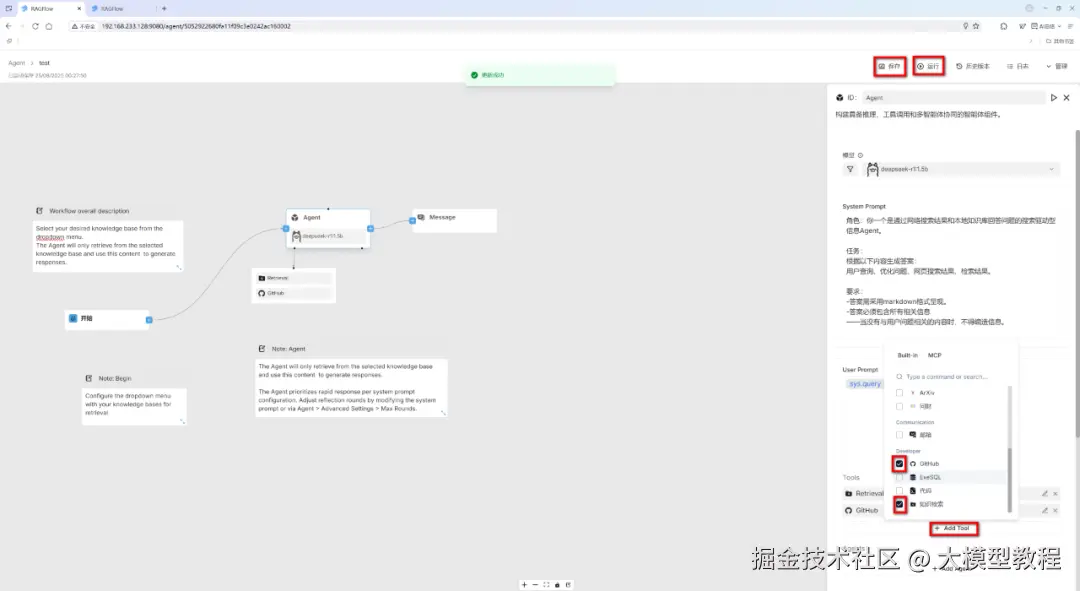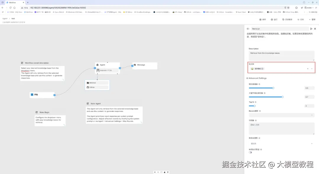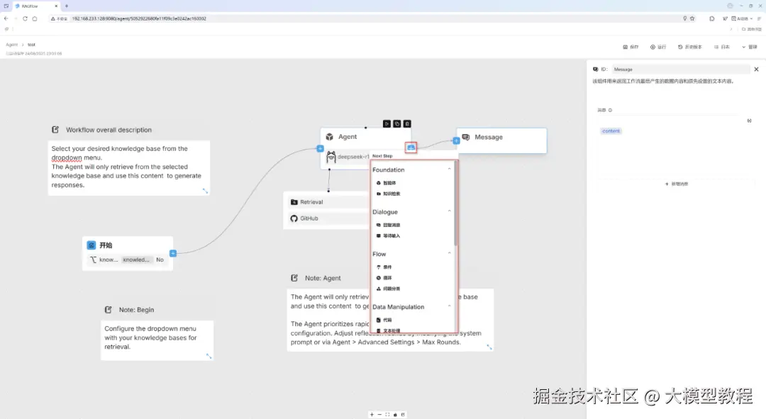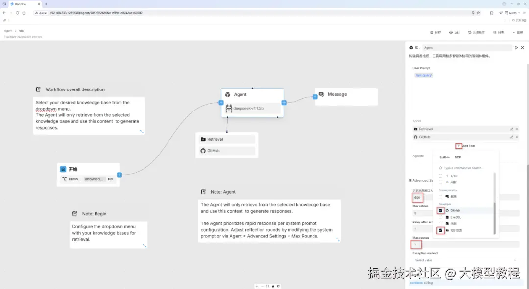 当然,RAGFlow 仍有提升空间:一是内置的工具插件与 Agent 模板数量还不够丰富;二是Agent编排界面的操作便捷性,相较于Dify工作流编排稍显逊色。当然,每个产品定位和在不同发展阶段各有侧重点,RAGFlow 当前的核心优势在于构建知识库,并深度结合大模型(如DeepSeek-R1)生成精准、上下文相关的回答。