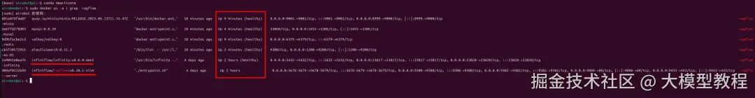在应用RAGFlow之前,我们需要先确保RAGFlow相关容器均已正常Up启起来了,且显示health健康状态。