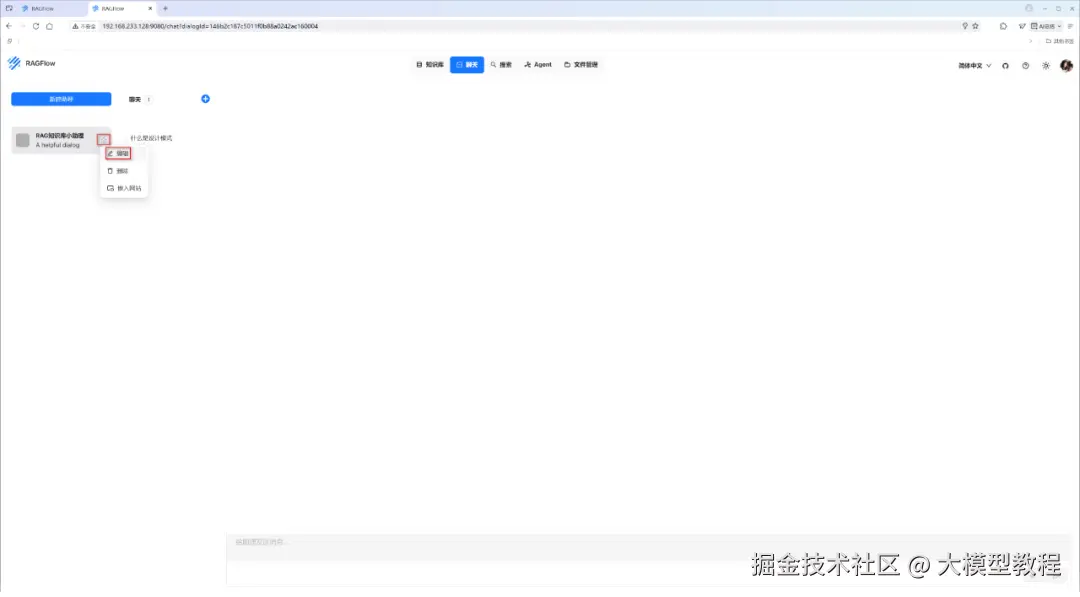 首先点击 RAGFlow 应用页面顶部导航菜单栏中的“聊天”,接着点击左侧的“新建助理”按钮,然后点击“编辑”,开始为你的知识库配置专属聊天助理。