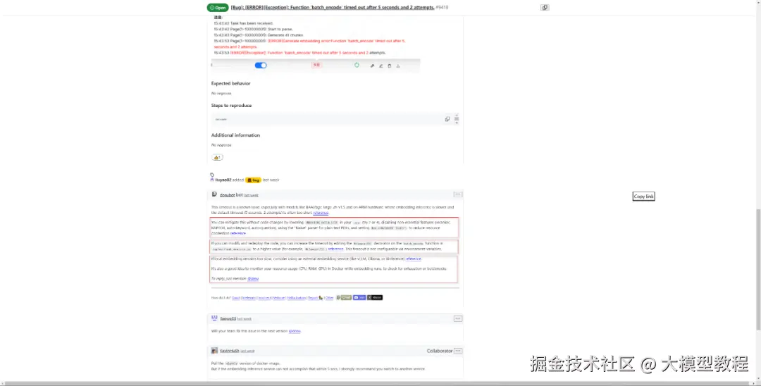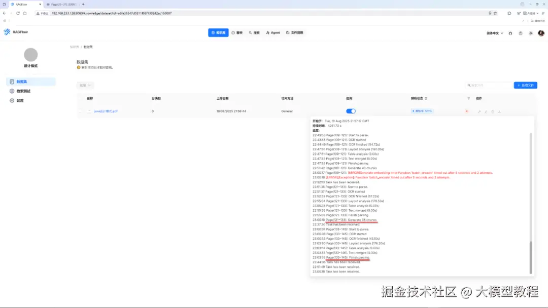 问题2:构建知识库时,上传文档在解析过程中报错:Page(109~121): [ERROR]Generate embedding error:Function 'batch_encode' timed out after 5 seconds and 2 attempts.