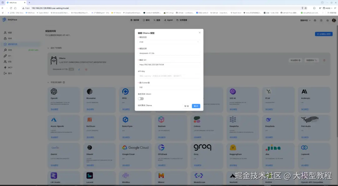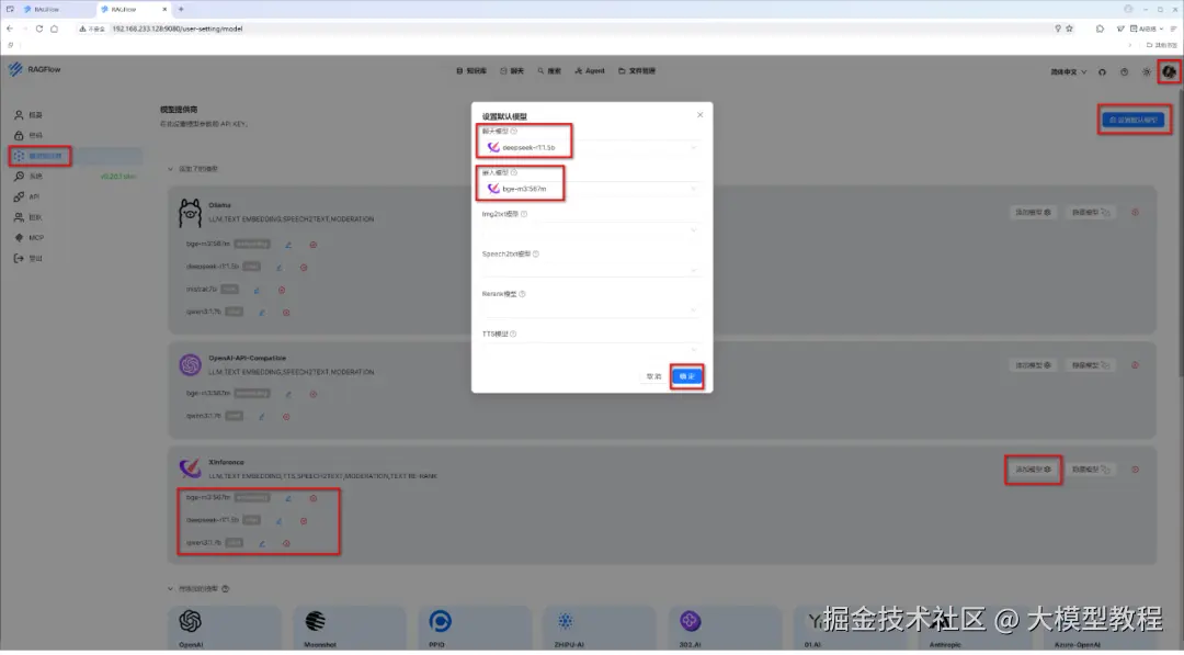 在应用 RAGFlow 之前,我们必须添加和设置默认的大模型 LLM 配置信息,以便在后续的 RAGFlow 应用过程中可以选择加载所需的模型。