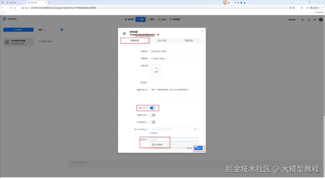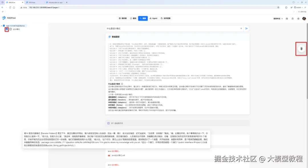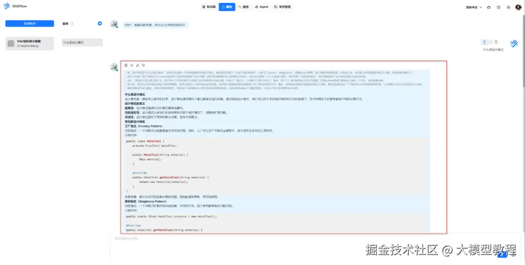 注意:在最下面的“知识库”选项中,选择我们在前面已构建成功的本地RAG专属知识库——设计模式。