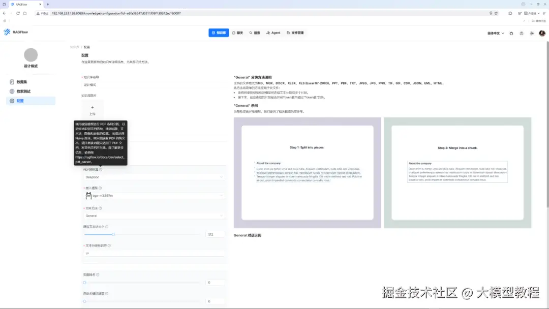 在点击“解析”按钮之前,我们需要先对准备构建的本地专属RAG知识库进行配置,这主要是为了预先设置告诉 RAGFlow:你具体将如何解析处理用户上传的文档数据,包括:PDF解析器、嵌入模型、切片方法、文本分段标识等关键点。