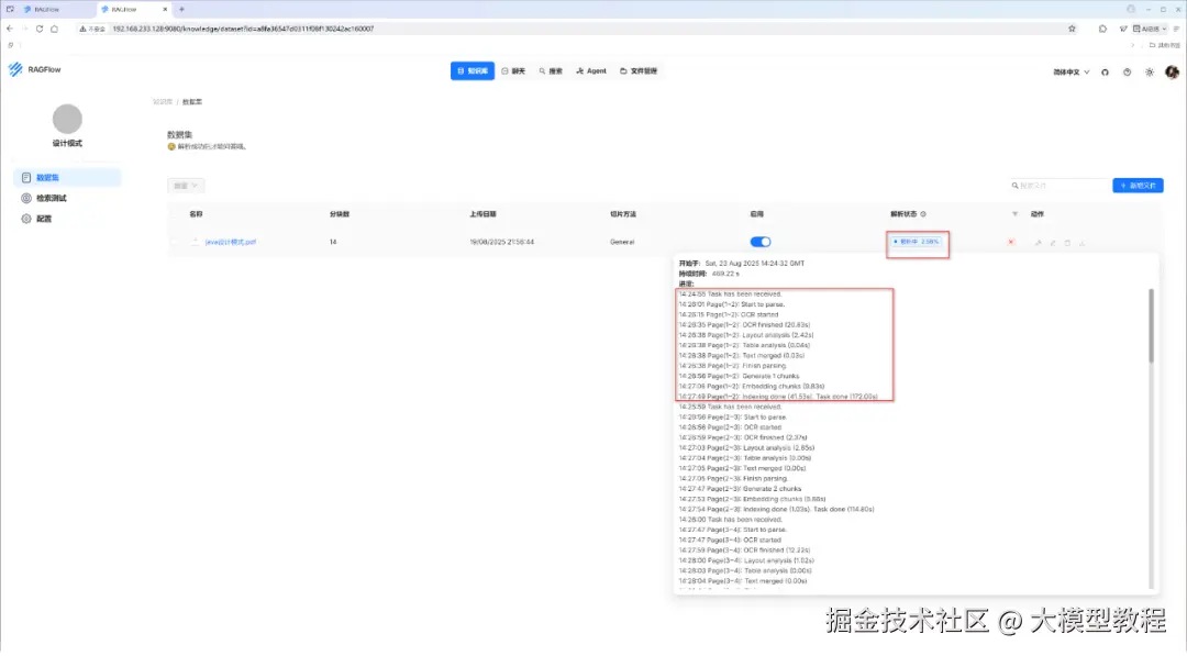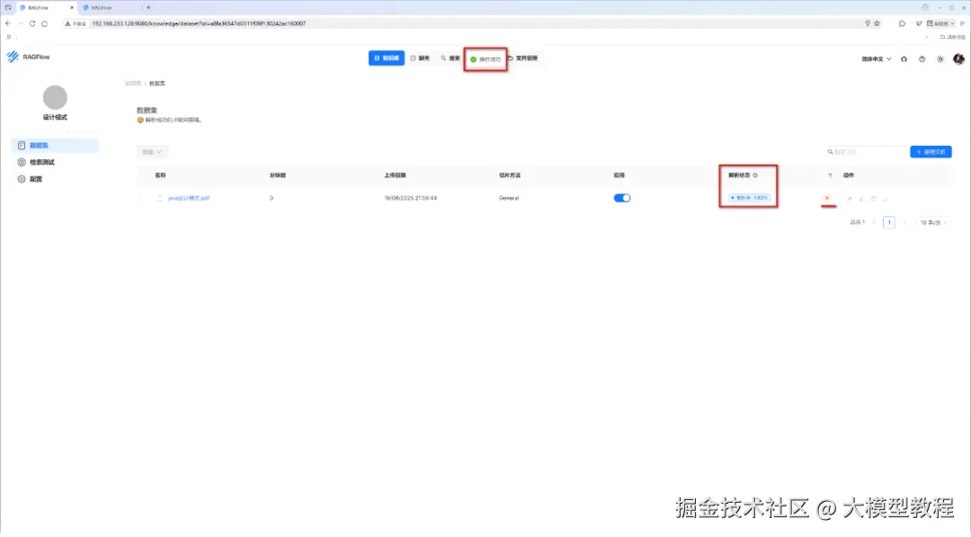 在上述配置完毕后,我们就可以点击“解析”按钮,此时会弹出一个“操作成功”的提示,RAGFlow 就正式开始处理上传的文档了。具体如下图所示: