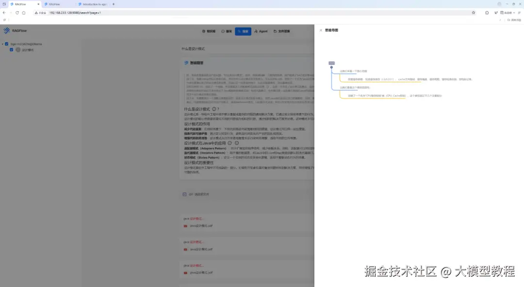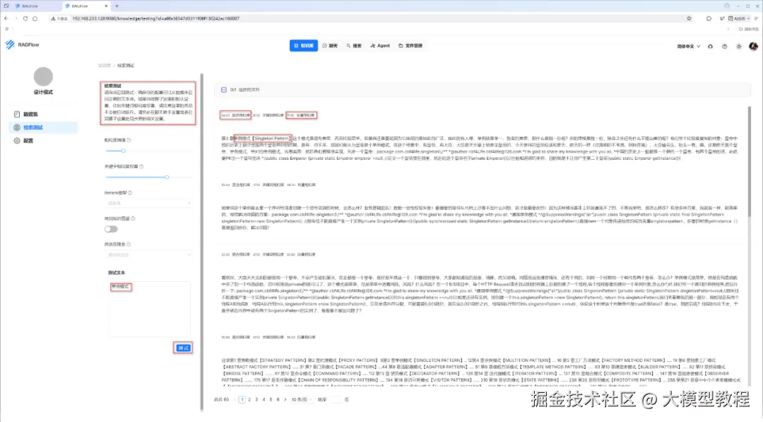 如上图可见,我们搜索“单例模式”,成功检索到了相关的文档片段,看起来效果还可以。