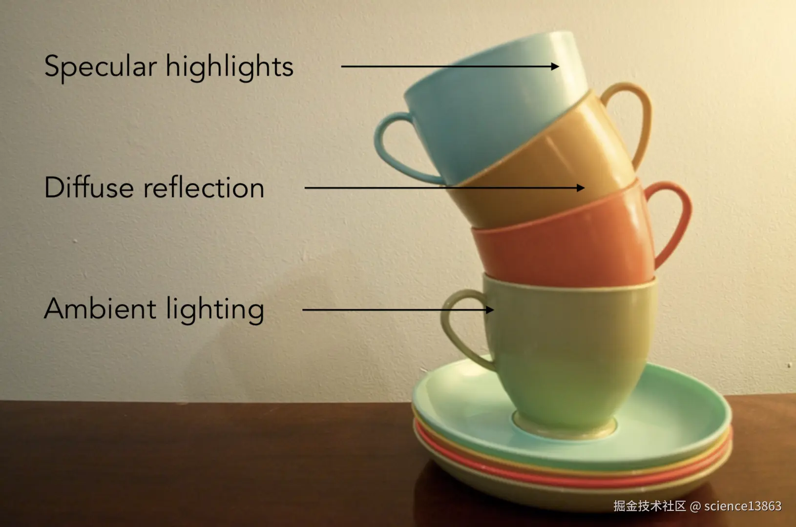 认真学过初中物理的都知道,物体的颜色是反射出去的颜色,所以决定颜色的因素就是光照。计算机图形学有时候为了提升效率,把光分为以下三种,镜面光、漫反射、环境光。