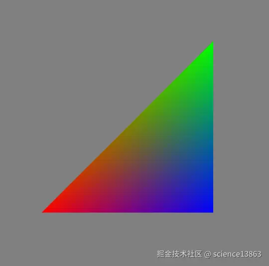 根据上一步获取到的所有点,自动插值计算它的颜色。比如我们上面的栗子,我们给点的只有三个定点的颜色,但是最终画出来的是彩色的,这个就是光栅化自动处理了中间的点,一般都是用重心插值算法,感兴趣的可以自己去搜,这里不做过多的算术推导。