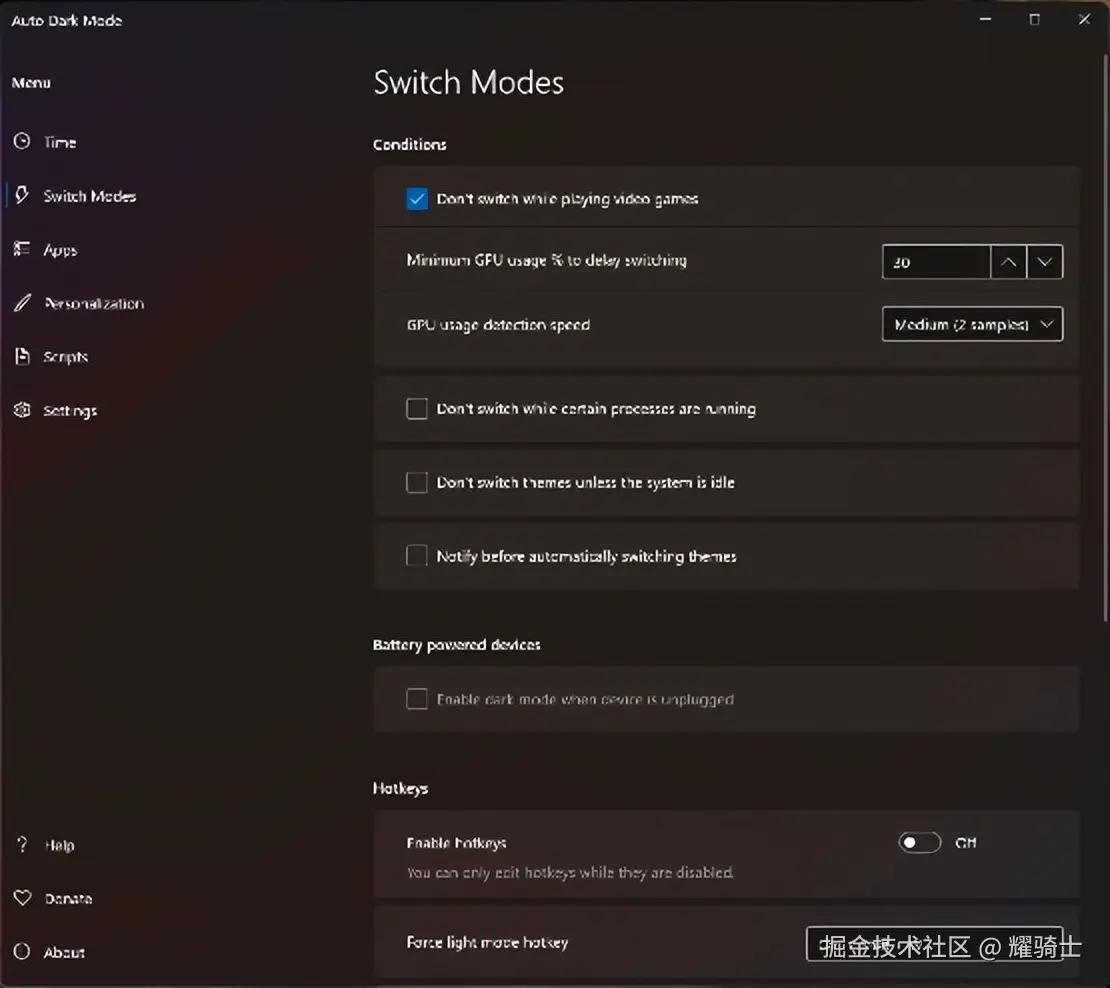 AutoDarkMode是一款自动切换Windows主题的实用工具,可根据时间段或日出日落时间自动在浅色模式与深色模式之间切换。用户可以自定义切换规则,还支持应用到壁纸、应用主题等场景,带来更舒适的使用体验,特别适合喜欢深浅模式自由切换的用户。
