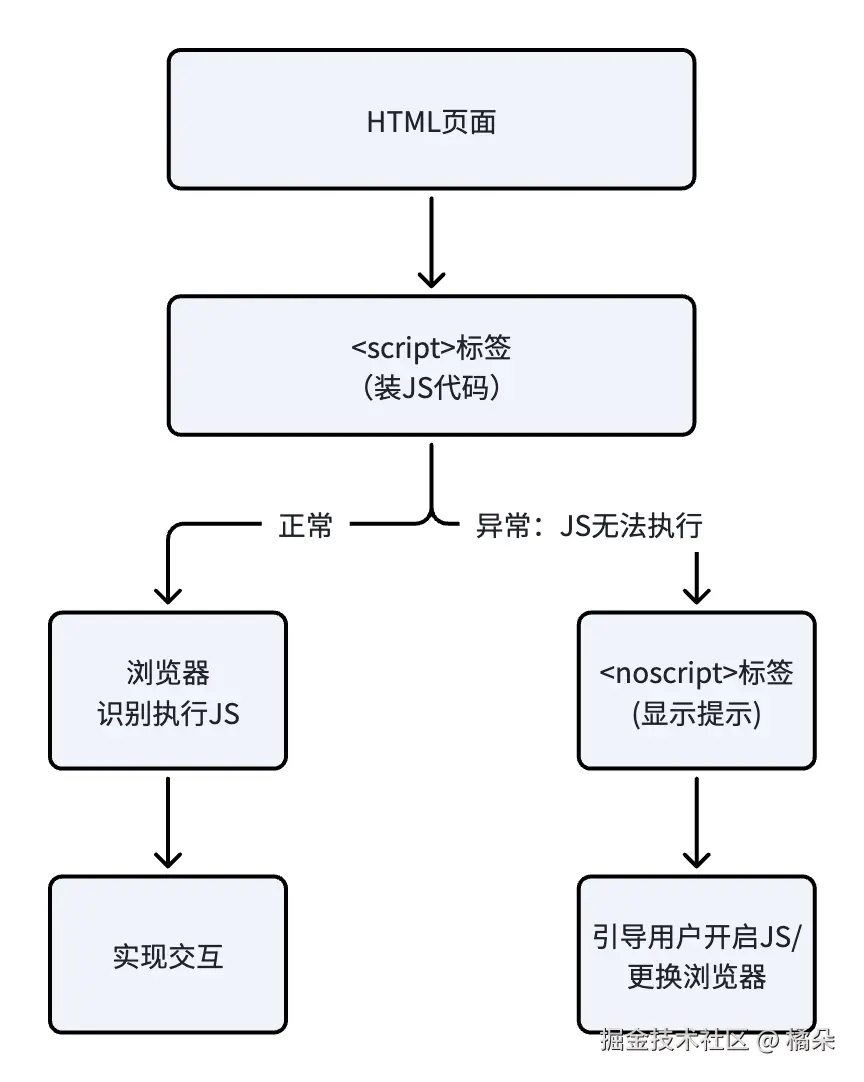 补充说明:现在大部分浏览器(Chrome、Edge、Firefox、Safari等)都默认支持JS,用户也很少会手动禁用JS,但作为前端开发者,我们要考虑到所有异常情况,加上<noscript>标签,是一种规范、严谨的开发习惯,也能体现我们的专业性。而且这个标签用法简单,不用写复杂逻辑,新手很容易掌握。