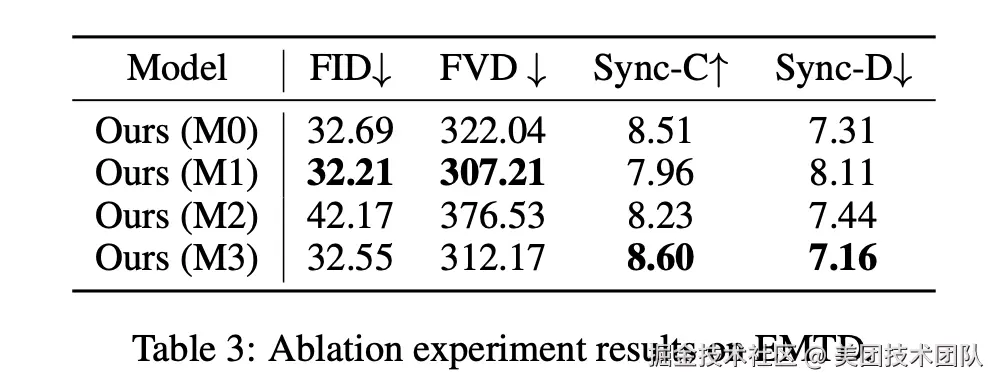 如表 3 所示,M0 策略因随机采样而控制强度过高,导致模型不恰当地复制参考动作,削弱了同步性。M1 策略虽然在视觉质量上表现尚可,但在同步性上表现较差,因为它过于严格地复制了边界帧。M2 策略因参考帧与上下文帧的时间距离过远,导致模型对身份和背景的控制力不足,最终在视觉质量(FID、FVD)上表现最差。