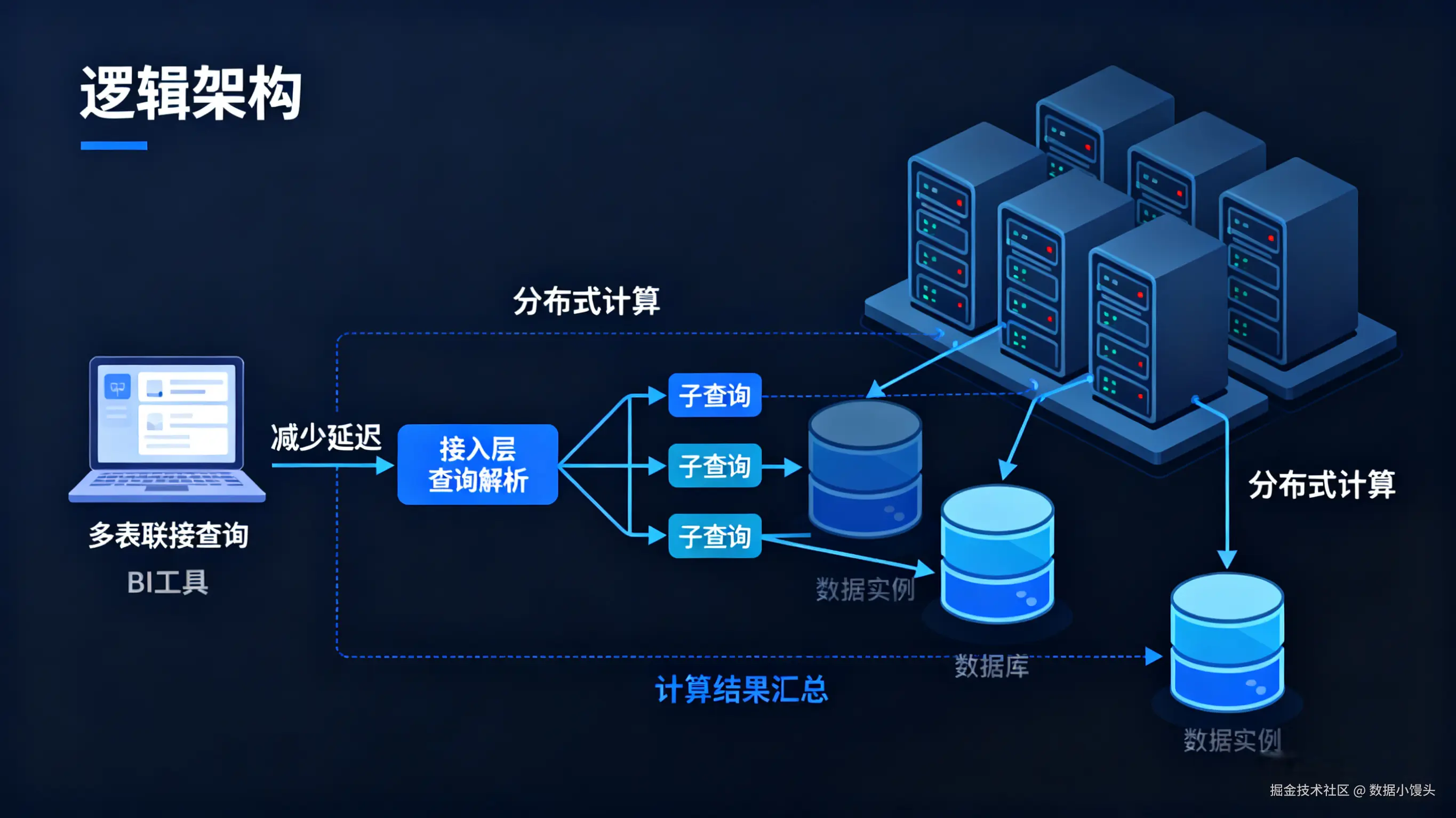- 查询解析与优化:接入层可以对 BI 工具的查询进行优化。例如,将复杂的多表联接查询分发到多台数据库实例上,进行分布式计算,减少查询延迟。