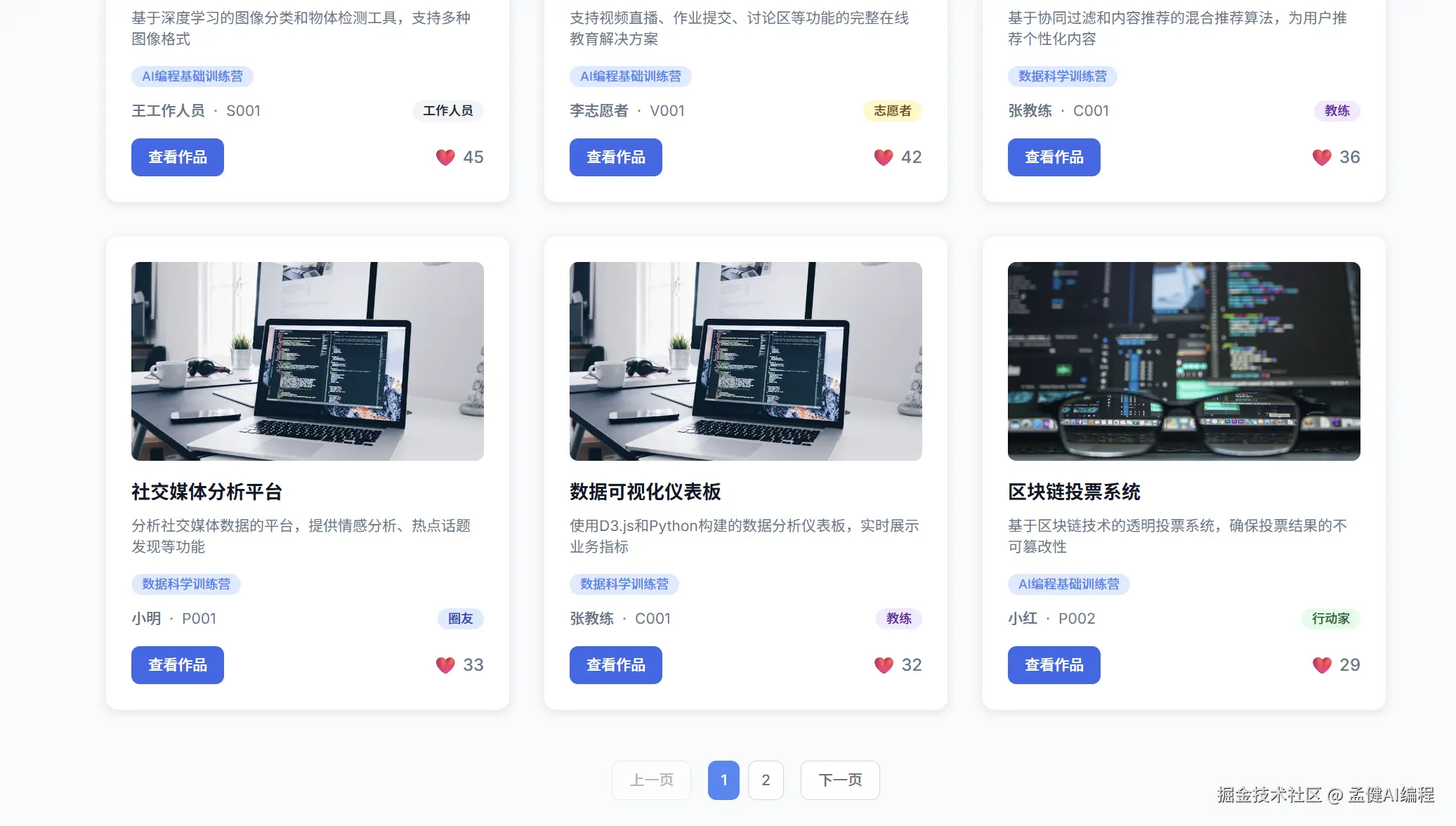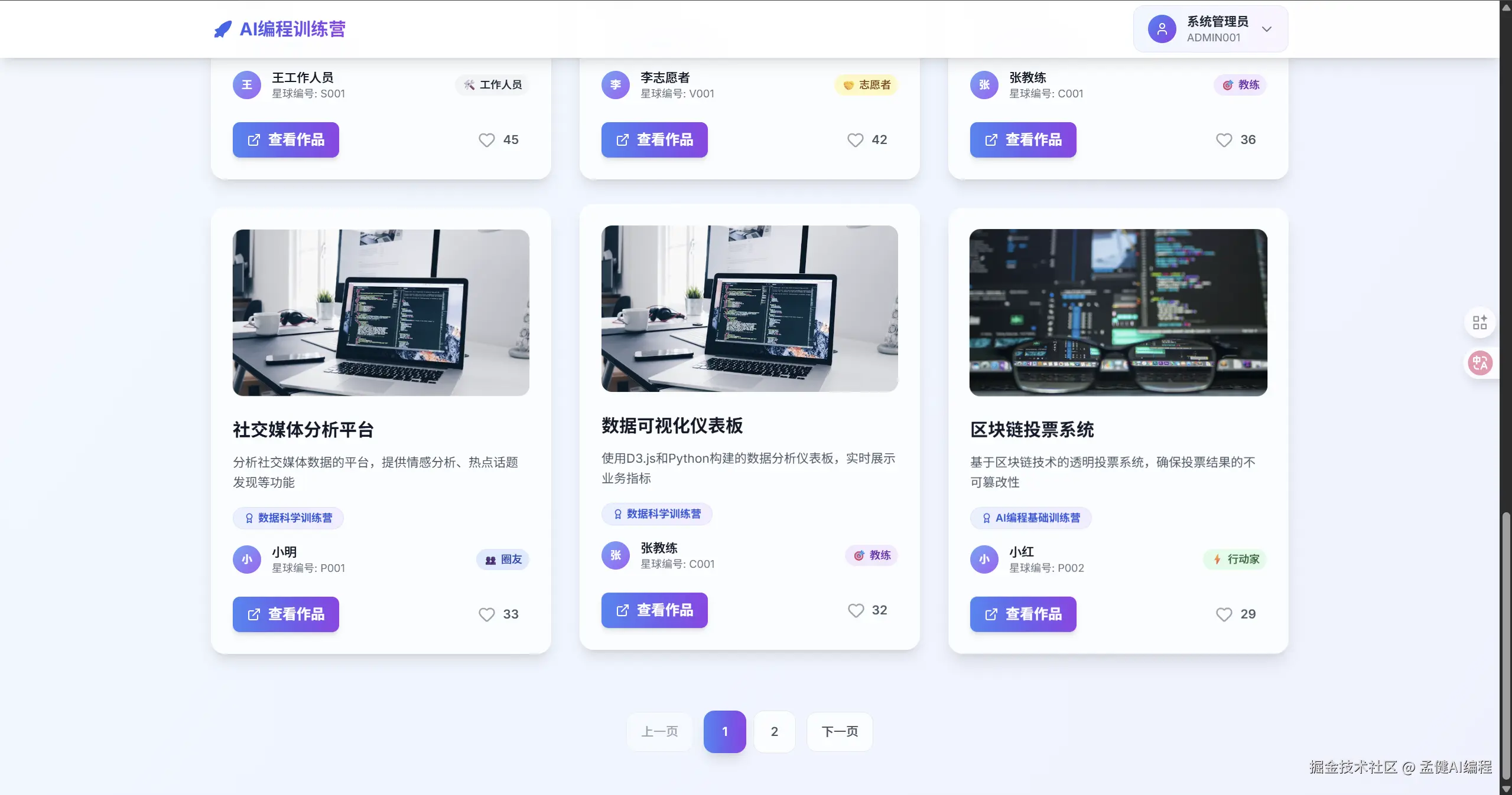 - 目前这一版本的视觉效果过于朴素,需要提升视觉美观度和吸引力,吸引学员展示作品,但注意整体的配色和控制动效数量