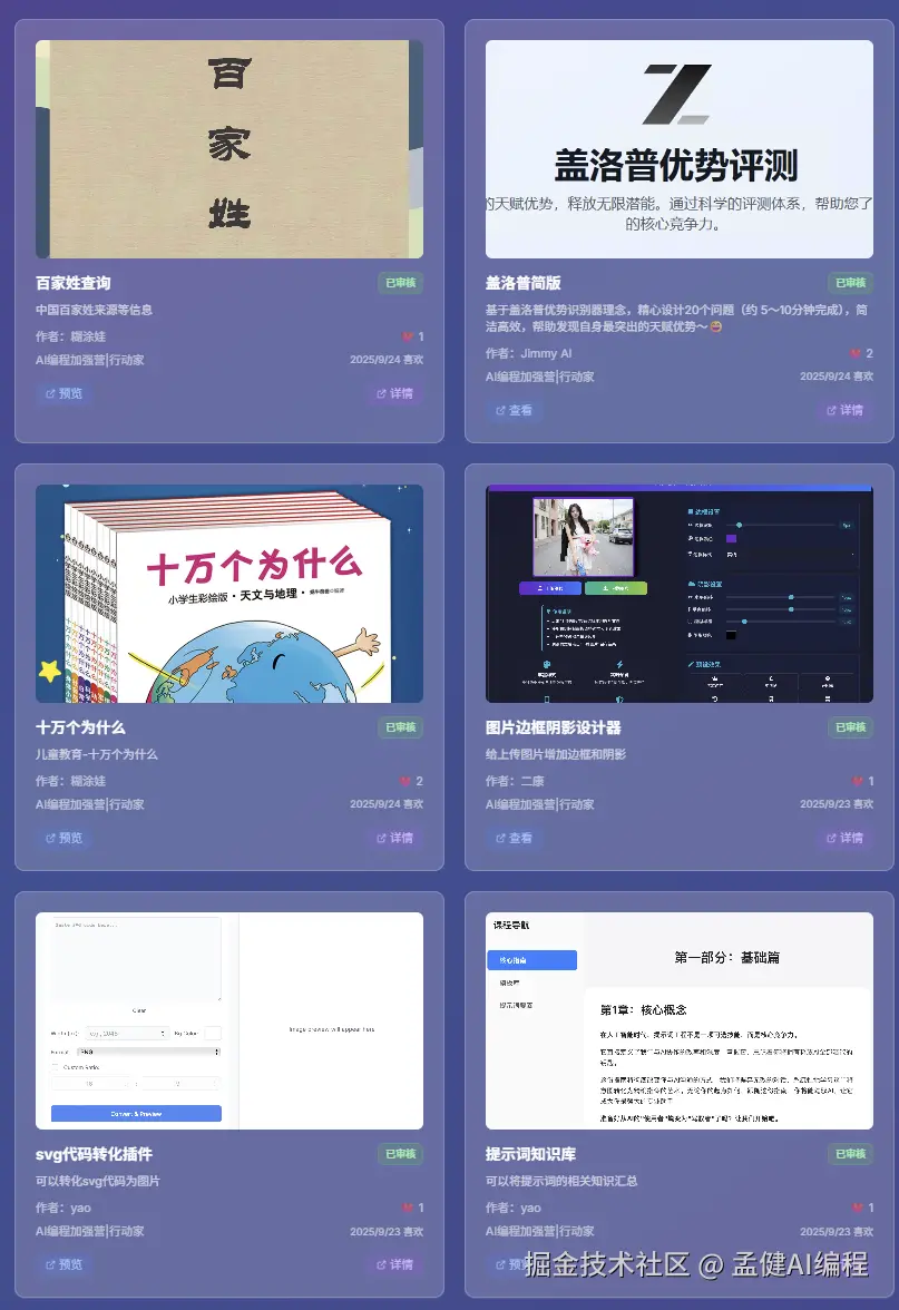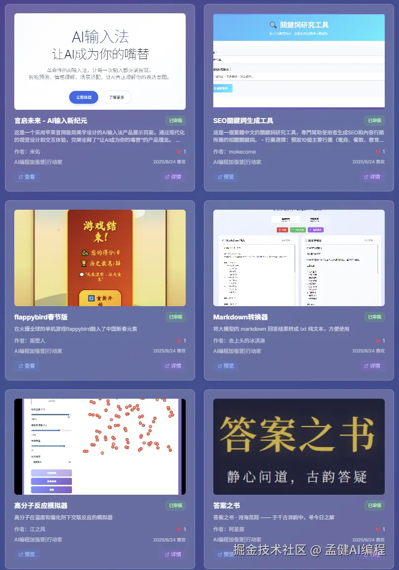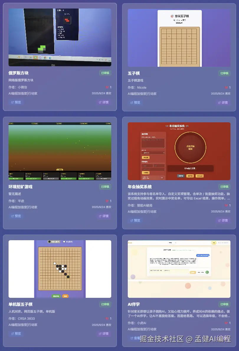 - 酷炫地展示大家的作品合集,目前训练营有好几期,而且不止一个训练营,比如行动家AI编程加强营、AI编程出海工具