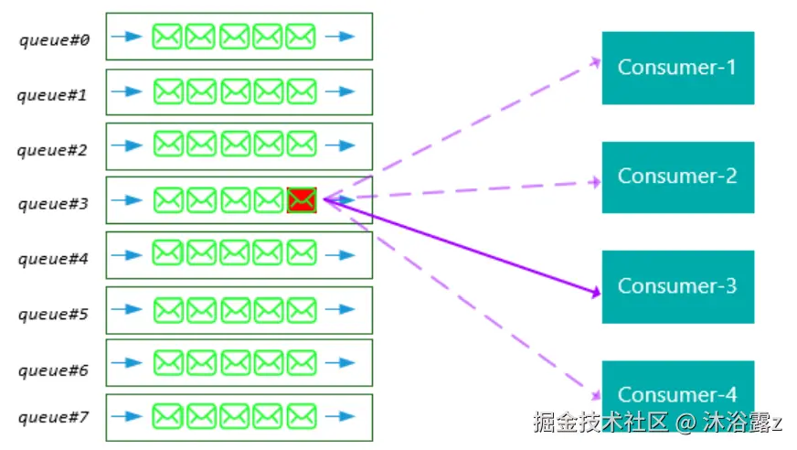 Consumer接到通知,采用Queue算法获取到对应的Queue,自主进行Rebalance。