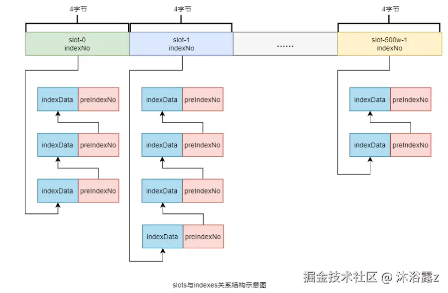 在每个index索引单元中增加了preIndexNo,用于指定该slot中当前index索引单元的前一个index索引单元。而slot中始终存放的是其下最新的index索引单元的indexNo。