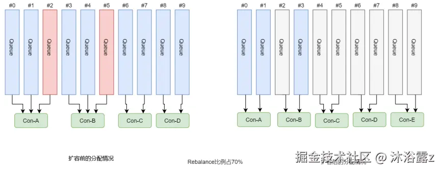 可以看到,平均分配算法在扩容后会连带从头开始的Queue的分配,Rebalance的比例很高