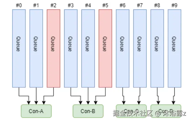 avg = QueueCount / ConsumerCount。整除的话直接平均分配;不能整除将多余的按Consumer的顺序依次分配
