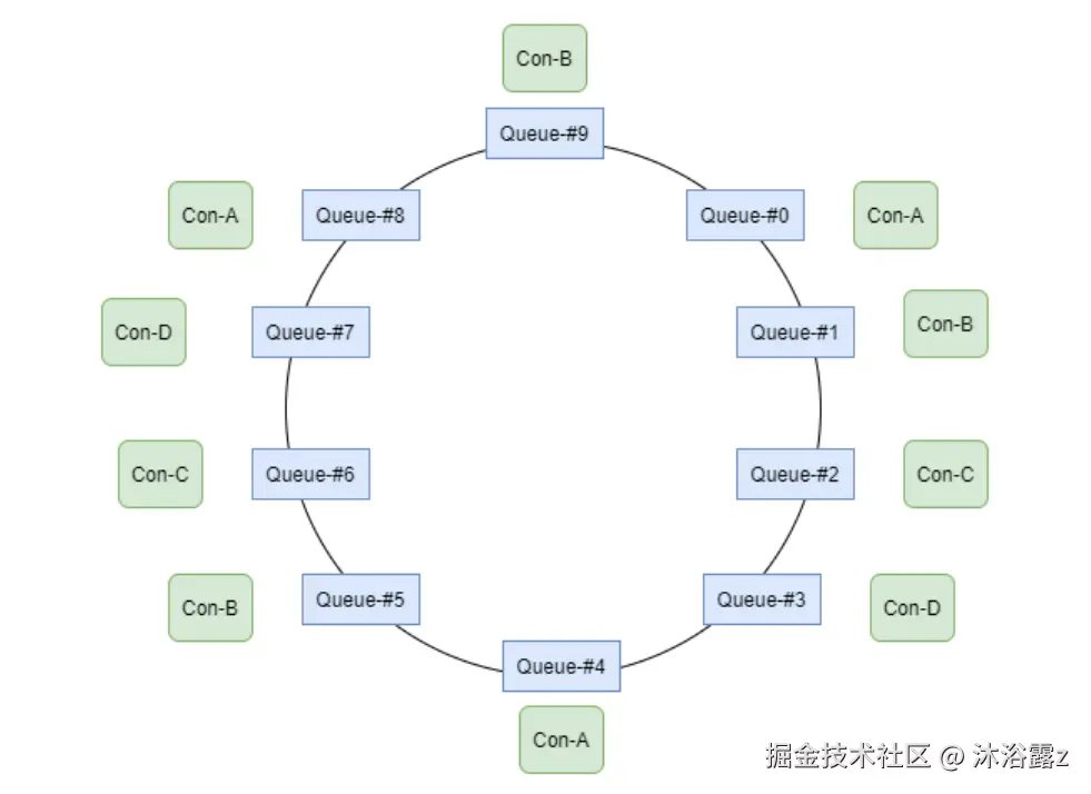 不用事先计算,根据消费者的顺序,依次在由queue队列组成的环形图中逐个分配。