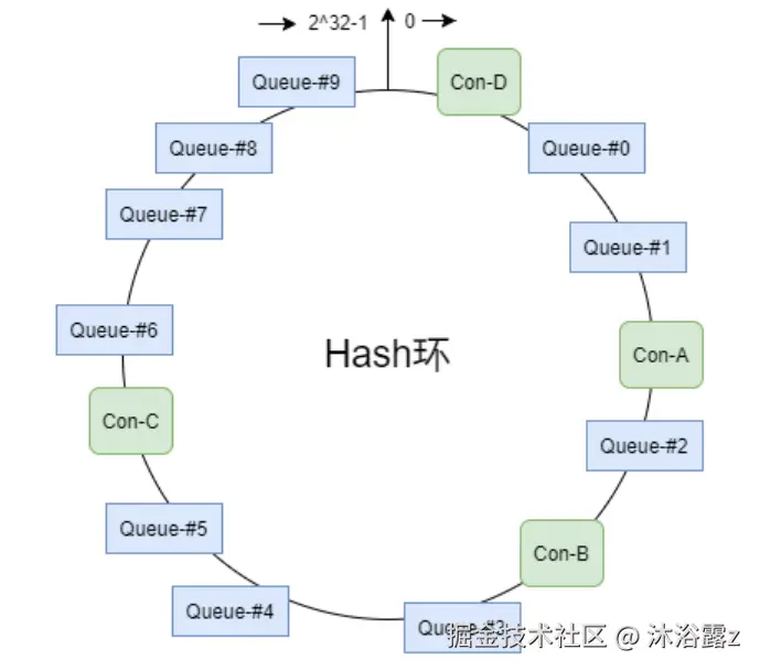 该算法会将consumer的hash值作为Node节点存放到hash环上,然后将queue的hash值也放到hash环上,通过顺时针方向,距离queue最近的那个consumer就是该queue要分配的consumer。