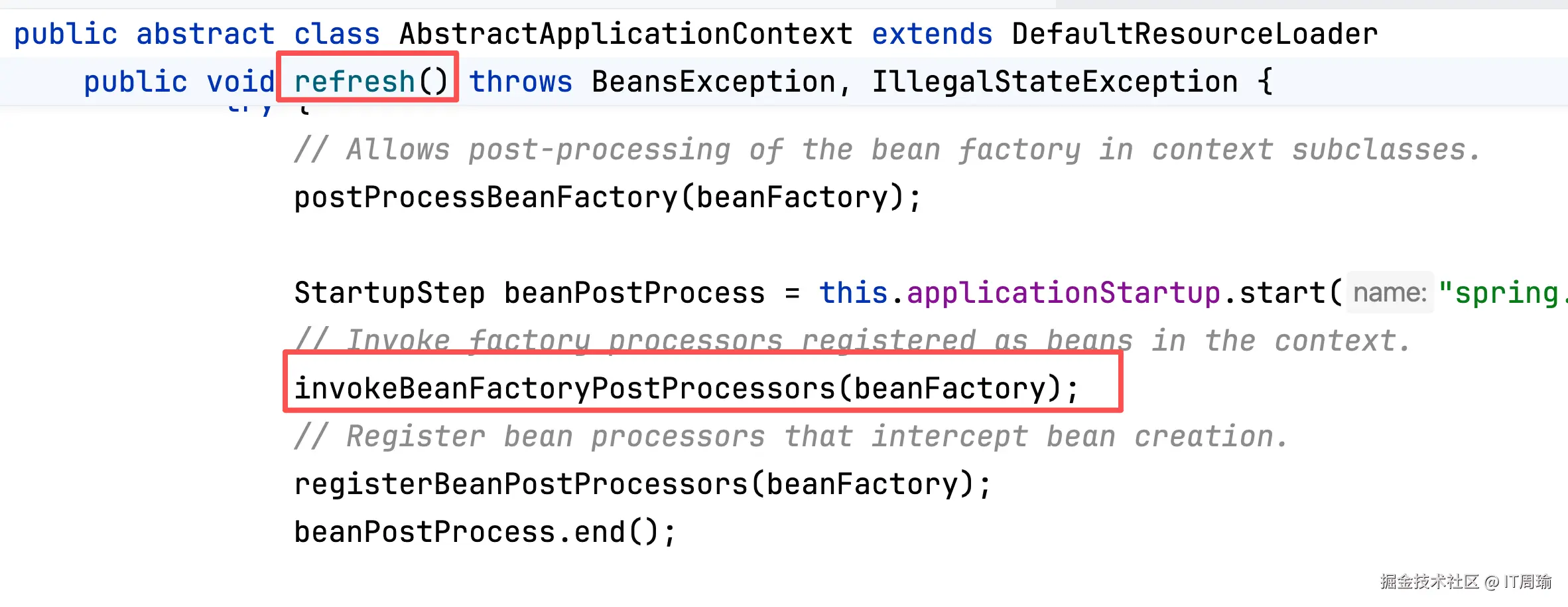 Spring容器启动过程就是执行refresh()方法,而在refresh()方法中有一个步骤叫做:执行BeanFactoryPostProcessor,俗称BeanFacotry后置处理器。
