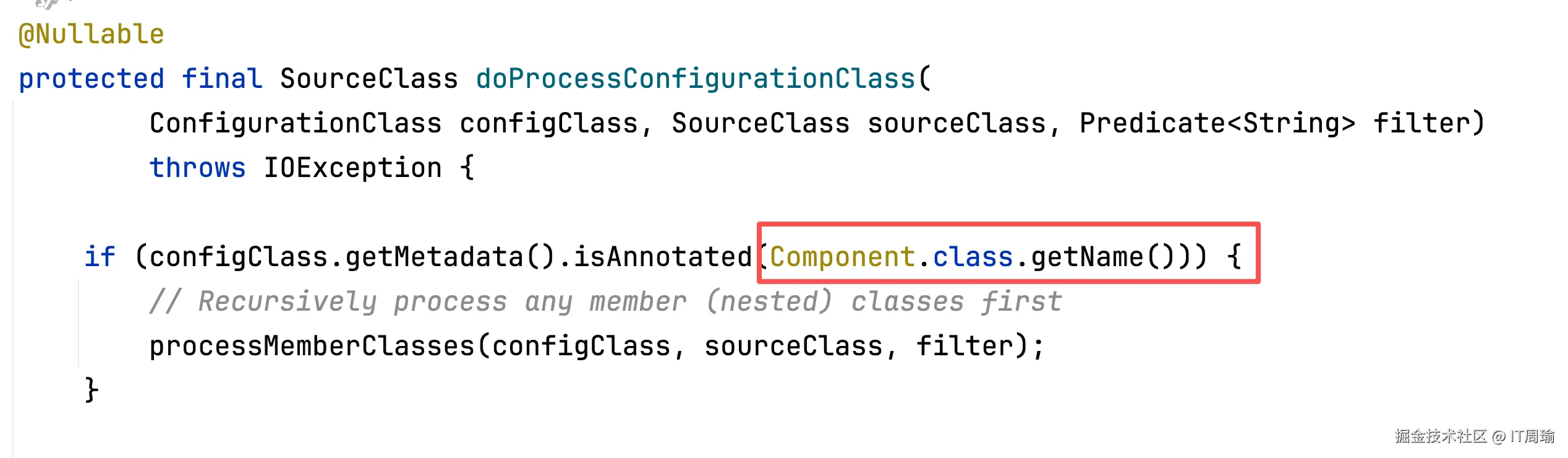 也就是说,Spring容器在启动时,会利用ConfigurationClassPostProcessor来对BeanFactory进行处理,处理啥呢?看名字就知道,处理ConfigurationClass,也就是配置类。