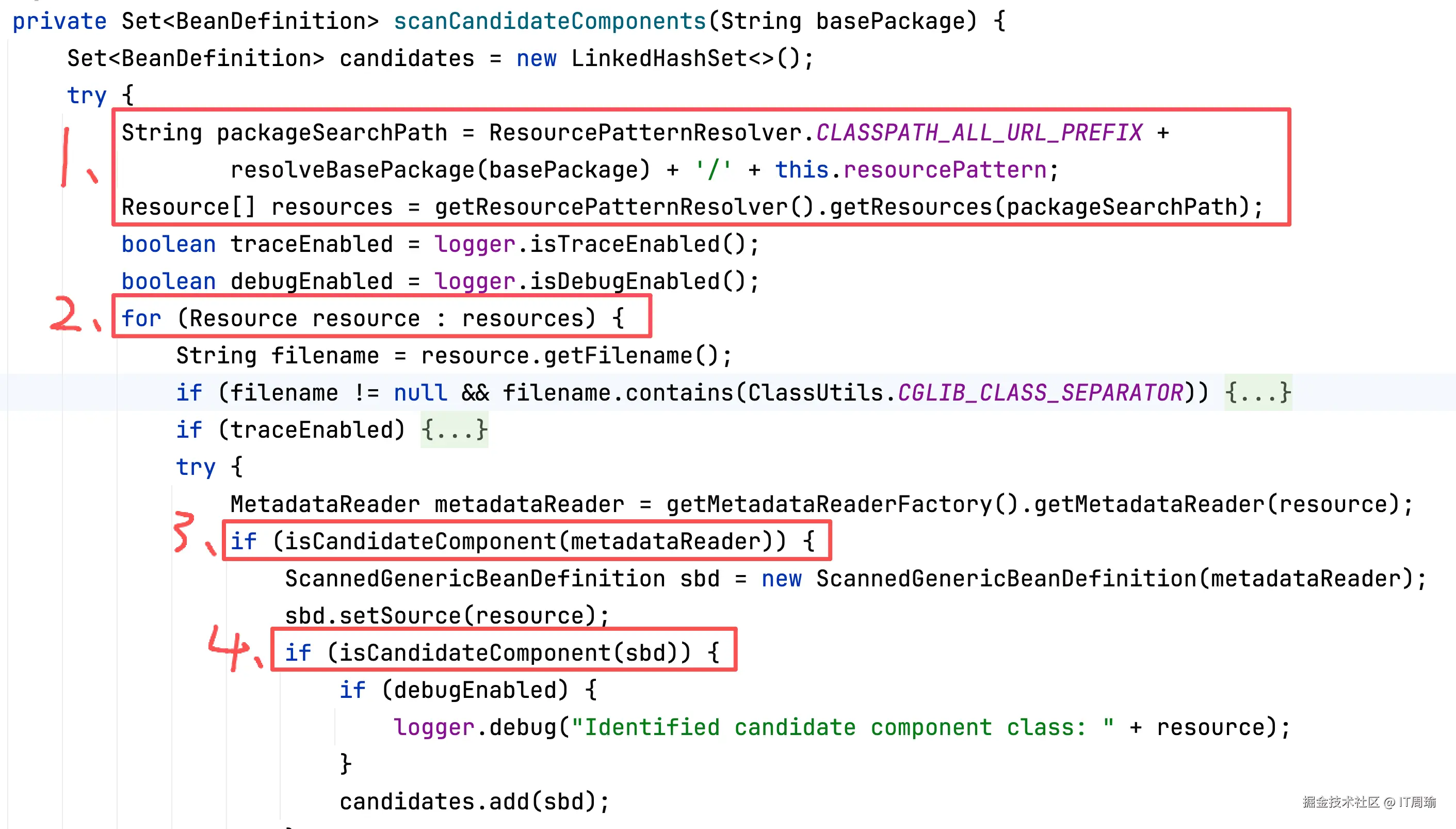 - 遍历basePackages,也就是说你可以定义多个扫描路径,如果你觉得你的项目启动慢,可以检查一下是不是扫描路径定义的太大了,扫描了太多无效的目录,因为你要理解,所谓扫描Bean,就是Spring要去遍历你指定的包路径下的每个类,去判断这个类是不是Bean,比如是不是加了@Component注解,如果加了就是Bean,没加就不是Bean,因此如果一个包路径下面类越多,Spring扫描起来就越耗时,这时候合理的拆分包路径,多定义几个更高效的包路径,会更好