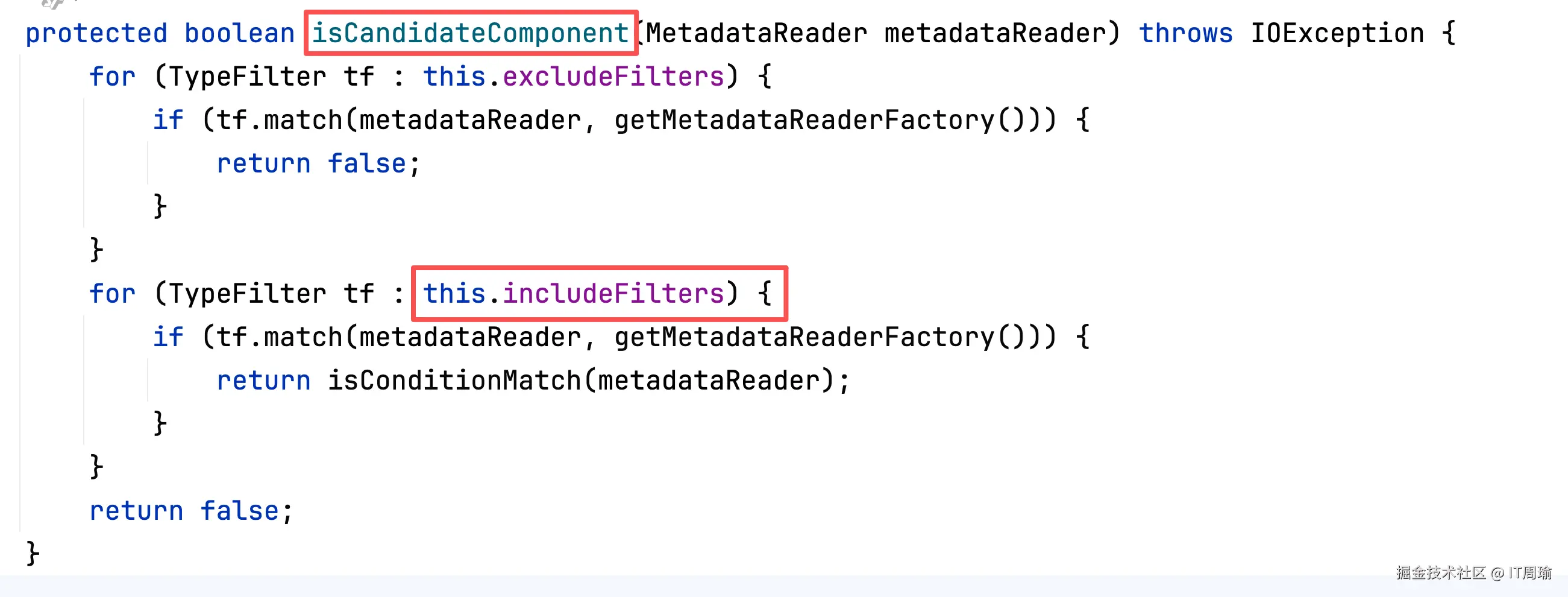 第三步,判断class文件对应的类符不符合excludeFilters和includeFilters,如果和excludeFilters匹配就过滤掉,如果和includeFilters匹配,就会调用isConditionMatch(),会进一步判断@Conditional条件注解。