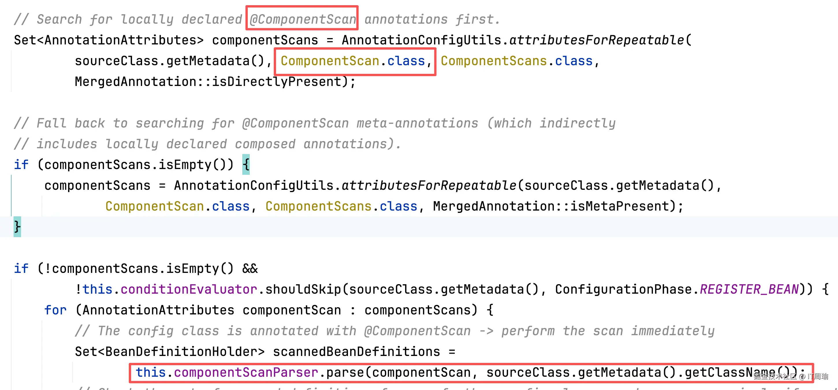 Spring会利用一个ComponentScanAnnotationParser解析器来专门负责解析@ComponentScan注解,话说人家这类名取得是真的简单明了,一看就知道是干嘛的,好的开源项目,代码写得好,自然没人吐槽。