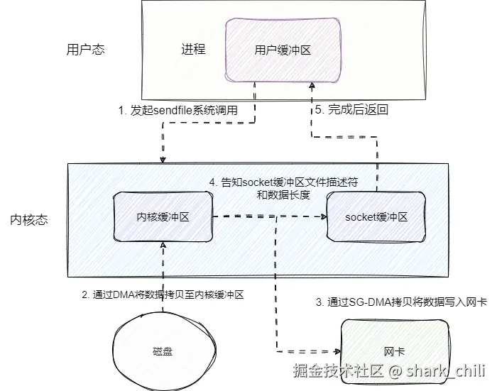 - sendfile:通过系统调用直接在内核空间中传输数据,避免了用户空间和内核空间之间的数据拷贝。