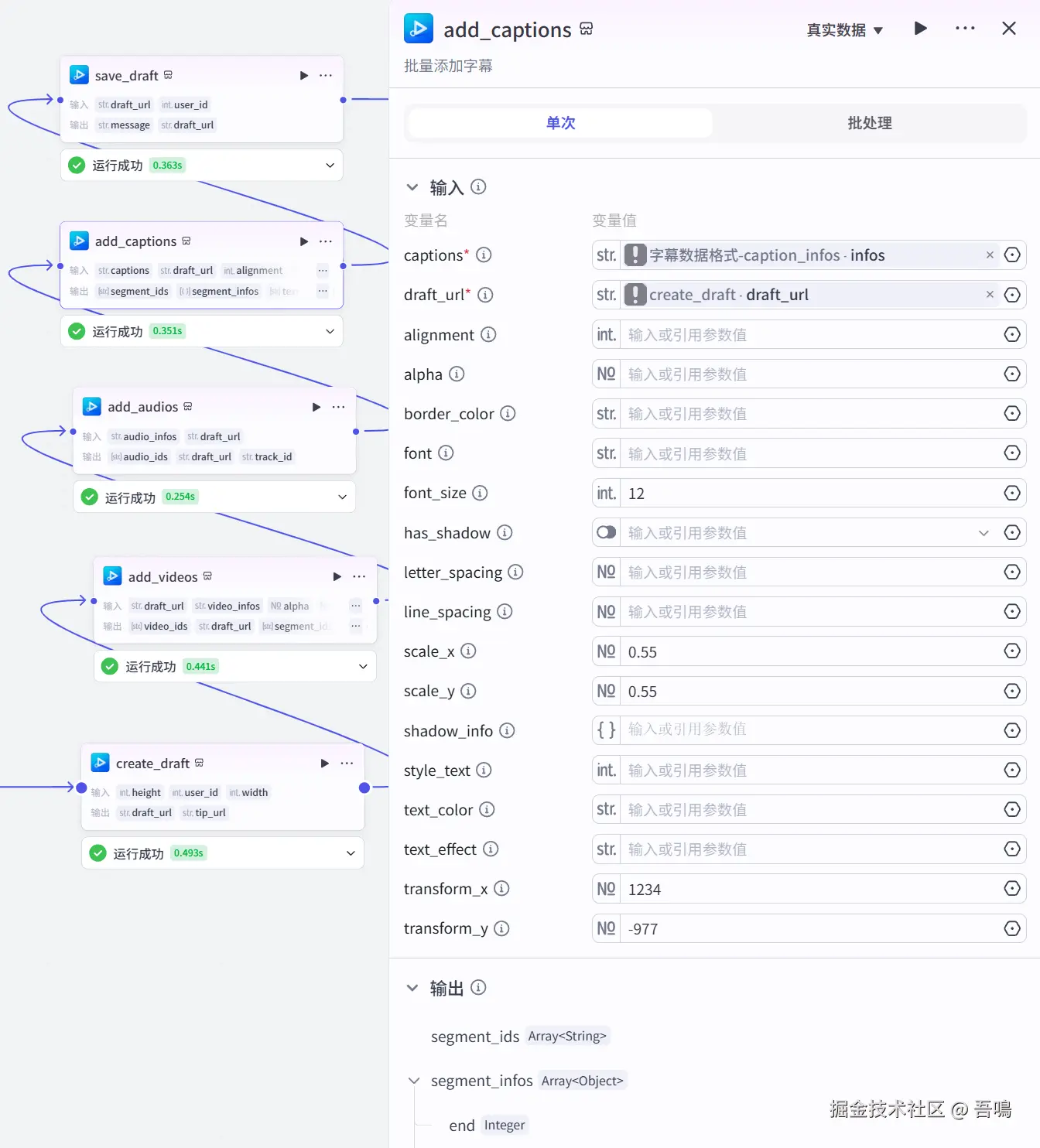 这个节点使用到了扣子第三方插件【视频合成_剪印小助手】的【add_captions】工具,往剪印草稿中添加字幕。